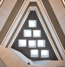 Tragwerk, Fassade und Dämmung in einer ehrlichen, authentischen Komposition umzusetzen – das war beim neuen Rathaus in Remchingen einer der Gründe für die Wahl von Liapor-Leichtbeton für die Gebäudehülle. Die monolithische Außenwand stärkt außerdem den Eindruck der soliden Wertigkeit des polygonalen Baukörpers und verleiht ihm hervorragende Eigenschaften hinsichtlich Innenraumklima und Akustik.