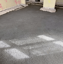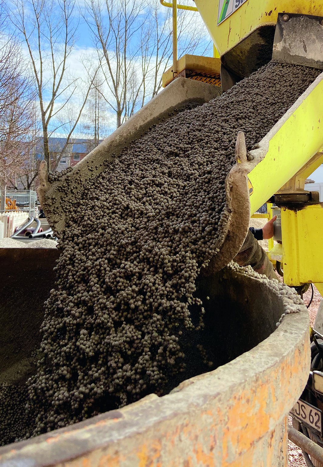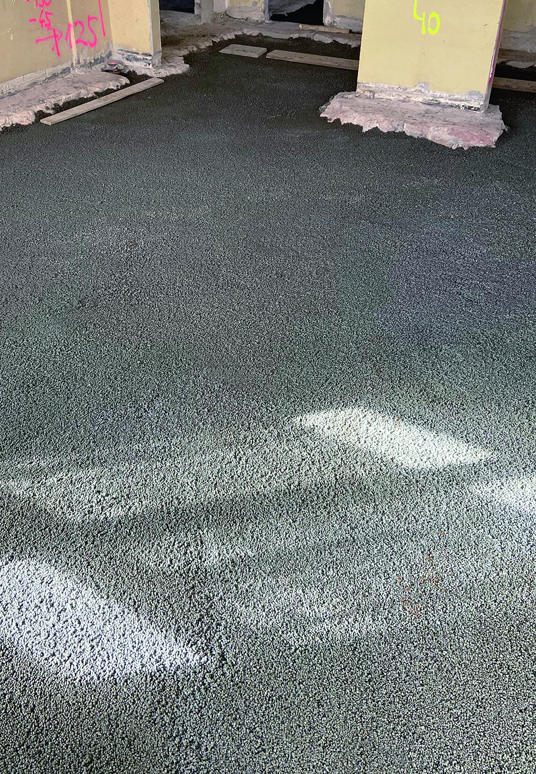 Die zementgebundene Liapor-Schüttung wurde mittels Schüttkübel und Rutsche in das Kellergeschoss verbracht.