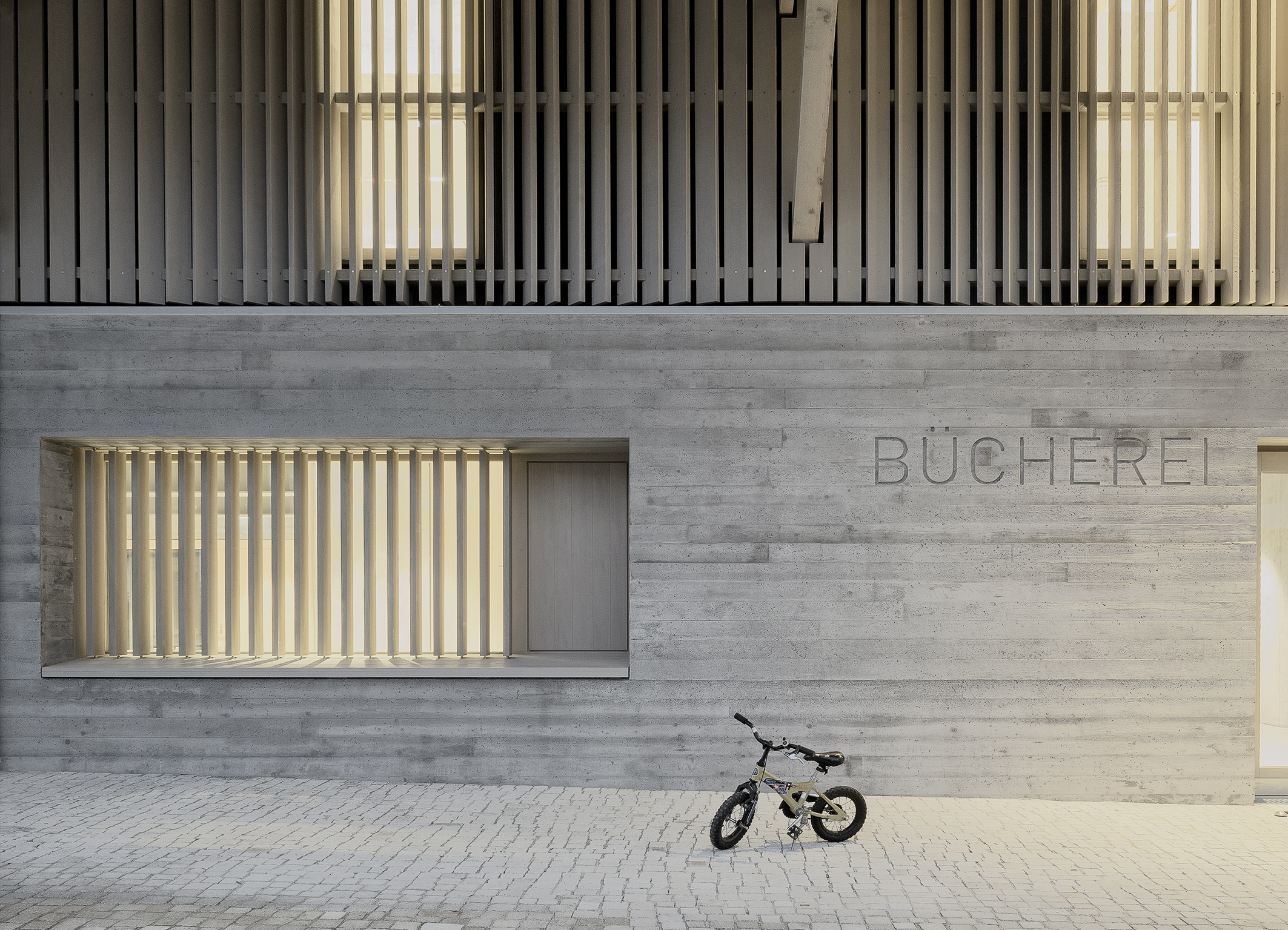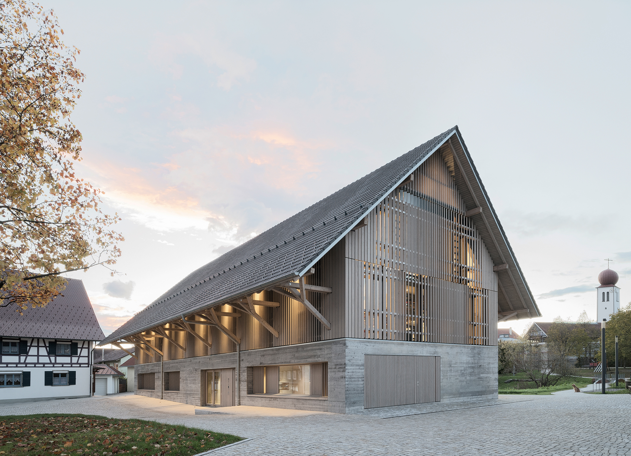 Der kleine Ort Kressbronn am Bodensee ist ein beschauliches Städtchen mit stark traditionell beeinflusstem Baubestand. Dies gilt auch für die 1923 im Ortskern zwischen Marktplatz und Festhalle errichtete Scheune. Sie prägte mit ihrem massiven Sockel, dem hölzernen oberen Tennengeschoss und dem weit auskragenden Satteldach über Jahrzehnte das Ortsbild von Kressbronn. Als die Gemeinde 2012 Steimle Architekten aus Stuttgart beauftragte, den Stadel in eine öffentliche Bücherei samt Bürgertreff umzuwandeln, war für Architekt Thomas Steimle deshalb auch klar: Der Umbau des früher landwirtschaftlich genutzten Stadels sollte den Charakter des Hauses bewahren, das weit auskragende, schützende Dach erhalten und auch die traditionelle Gliederung in ein massives Erdgeschoss und ein darüberliegendes filigranes Tennengeschoss übernehmen. „Dem baulichen Erbe mit Rücksicht und Respekt zu begegnen und den alten Stadel mit einfachen, präzise gesetzten und wohldurchdachten Eingriffen in ein modernes, offenes Haus zu transformieren, waren die Leitgedanken für unseren Entwurf“, erklärt Thomas Steimle.