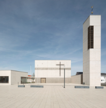 Die neue Kapelle des Gemeindezentrums in Kerpen-Manheim wurde monolithisch aus Liapor-Leichtbeton errichtet. Ausschlaggebend waren die besondere Optik und Materialität des Baustoffs, der die Kirchenobjekte im Inneren in einen ganz neuen Kontext setzt. Außen wurde die Fassade teilweise gestockt, um den Sockelbereich und den Namenszug farblich und strukturell vom Rest des Kirchenbaus abzuheben.