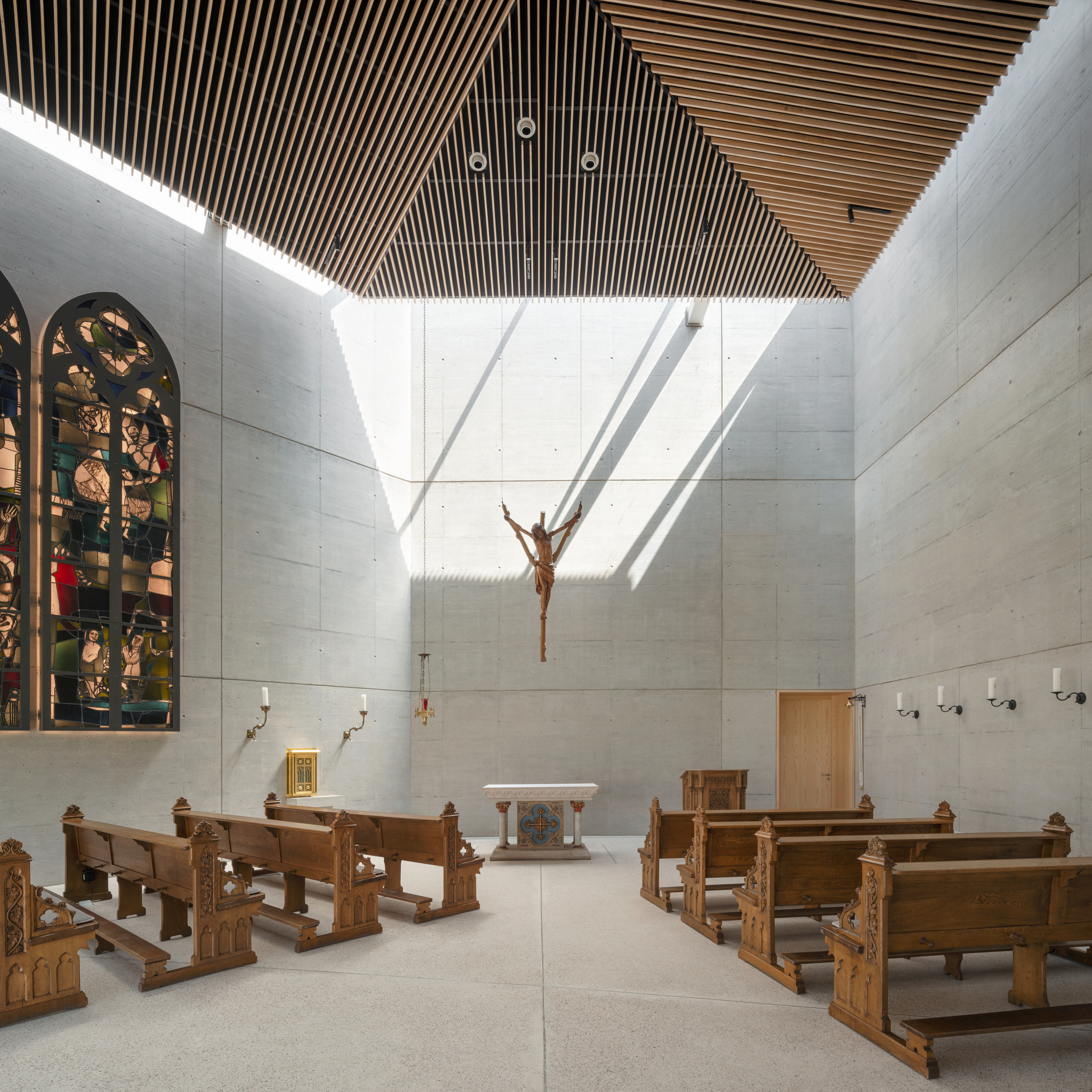 Für den Bau der Kapelle wurden rund 350 Kubikmeter Leichtbeton der Betongüte LC12/13 D1.2 aus Liapor 3,5 und Liapor-Sand K0/2 eingebaut. Hergestellt und geliefert wurde dieser von der Fertigbeton Rheinland GmbH in Düren, die Ausführung übernahm die Zervos Hoch- und Schlüsselfertigbau GmbH in Erftstadt. Der Rohbau fand 2021 innerhalb weniger Monate statt, und die Betonage erfolgte mittels einer Trägerschalung. In sie wurde eine feine Rahmenlattung eingelegt, die sich auf den Sichtbetonflächen wiederfindet und das Schalungsmuster dezent verstärkt. Die gesamte Verarbeitung des Liapor-Leichtbetons verlief ohne Probleme: „Der Baustoff ließ sich sehr gut verarbeiten“, erzählt Berthold Jungblut. „Bis auf wirklich minimale Kosmetik war keinerlei Nacharbeitung erforderlich und alle Sichtbetonflächen sind hervorragend gelungen.“