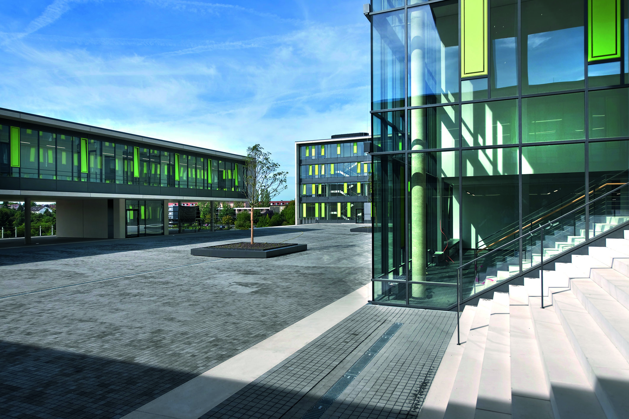 Die Julius-Maximilians-Universität Würzburg wurde 1582 gegründet und zählt damit zu den ältesten Hochschulen Deutschlands. Zur Universität gehört auch die Hochschule für angewandte Wissenschaften Würzburg-Schweinfurt mit zehn Fakultäten und rund 8.600 Studierenden. Vor Kurzem sind die Bereiche Gestaltung und Informatik in einen neuen, modernen Campus am Würzburger Sanderheinrichsleitenweg gezogen. Das oberhalb der Stadt gelegene Objekt wurde konzipiert und umgesetzt von den Gerber Architekten aus Dortmund, die mit ihrem Konzept den 2004 vorausgegangenen Architekturwettbewerb gewannen. Das Hochschulgebäude besteht aus einem nördlichen, viergeschossigen Teil und einem zweigeschossigen, auf Stelzen ruhenden Bereich im Süden, die beide über einem zweigeschossigen Sockel in die Hanglandschaft eingebettet sind. Beide Gebäudeteile sind L-förmig ausgeführt und umschließen mit ihren Glasfassaden so den dazwischen liegenden Freiraum. Das Ergebnis ist ein einladender, offener Innenhof, der durch den aufgeständerten Gebäudeteil hindurch einen imposanten Ausblick über den Würzburger Talkessel bietet. Direkt darunter befindet sich eine offene Garagenebene, die in den Hang hineingebaut wurde. Als Bauherr fungierte der Freistaat Bayern, vertreten durch das Staatliche Bauamt Würzburg, als ausführendes Bauunternehmen zeichnete die ihb Product GmbH Schleusingen verantwortlich.