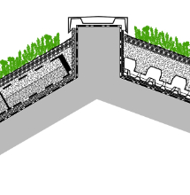 Auf der steileren Dachseite mit 43 Quadratmetern und einer Neigung von 30 Grad setzte ZinCo auf den Systemaufbau „Begrüntes Steildach“ mit Georaster. Die Georaster-Elemente aus nahezu vollständig recyceltem Kunststoff werden an den Stößen verklippt und verfügen über verstärkte Mittelstege zur Schubabtragung. Wie Bienenwaben angeordnet, bietet dieses System auch bei steilen Dächern bis zu 35 Grad Neigung hohe Stabilität und viel durchwurzelbaren Raum. So war es möglich, auch diese Dachhälfte ohne eine einzige Schubschwelle zu begrünen. Unter dem Georaster ist die Wasserspeichermatte (WSM 150) in der Lage, viel Feuchtigkeit aufzunehmen und diese über die Kapillarkräfte des Substrats an die Pflanzen abzugeben. Der Eintrag des Substrats und das Aufbringen der Vegetationsmatten erfolgten analog zur anderen Dachseite.