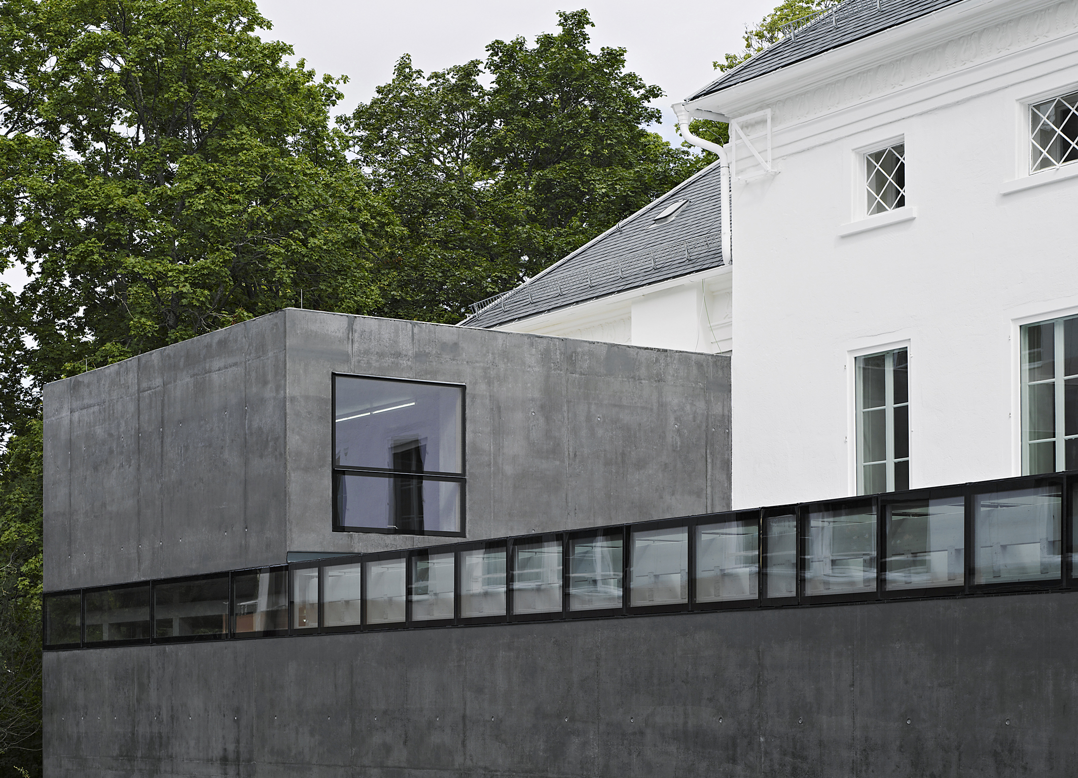 Mit seiner Form und Materialität, aber auch durch die monolithische Bauweise steht der Neubau im Wechselspiel zum klassizistischen Altbau.