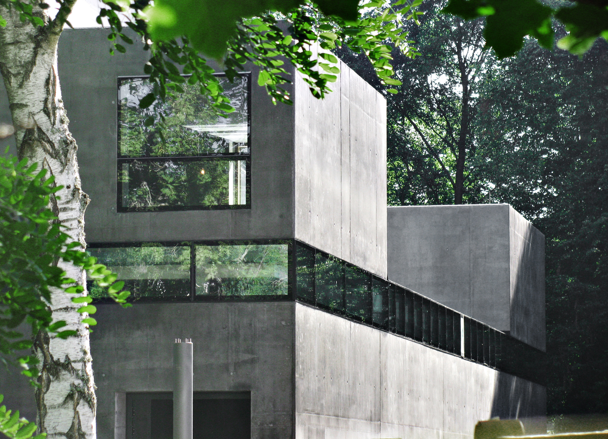 Das alte Bestandsgebäude wurde saniert und rückseitig um einen neuen Anbau aus schwarz eingefärbtem Liapor-Leichtbeton in Sichtbetonoptik ergänzt.