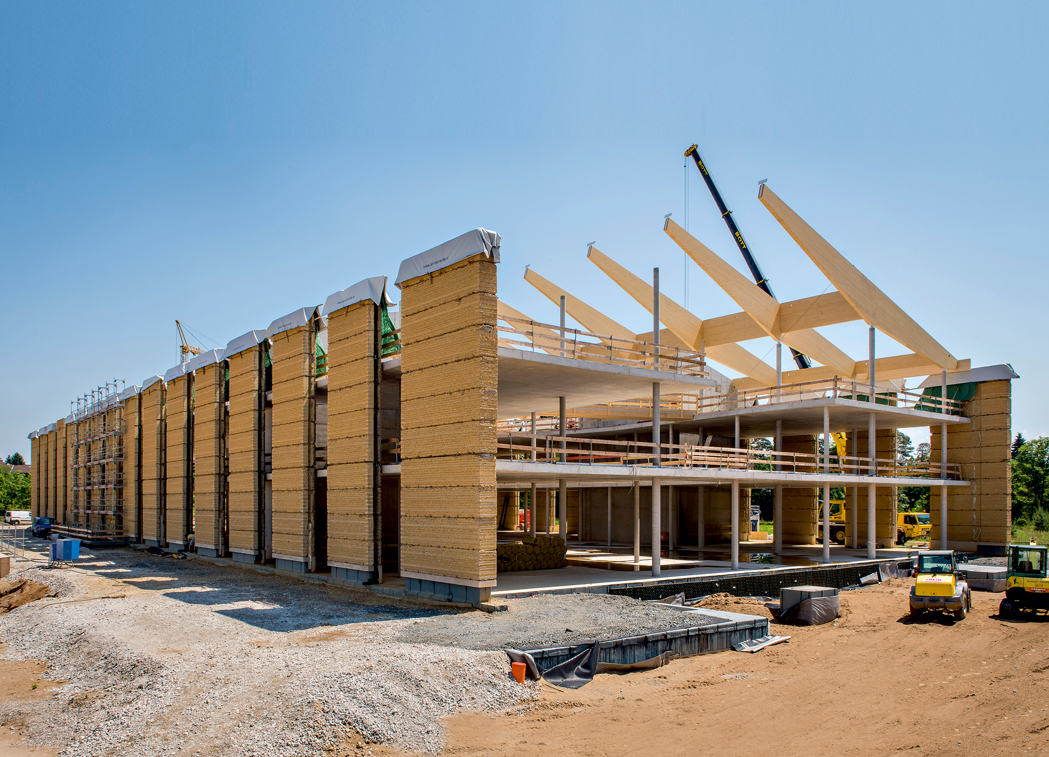 Die Lehmelemente passen in ihrer Materialität perfekt zum Neubau, der den Unternehmensgrundsätzen folgend auch selbst ganz auf Ökologie, Natürlichkeit und Nachhaltigkeit ausgerichtet ist. So ist das Gebäude dank der Verwendung natürlicher, wiederverwertbarer Baustoffe ein in der Gesamtbilanz nahezu klimaneutrales Bauwerk. Eine Photovoltaik- und eine Geothermieanlage liefern die nötige Energie und ein Erdkanal sorgt für Frischluft. Die Gebäudegeometrie mit dem offenen, asymmetrischen Dachfirst erlaubt gleichzeitig eine optimale, natürliche Tageslichtnutzung in allen Gebäudestockwerken. Konzipiert wurde die neue Firmenzentrale mit rund 13.000 Quadratmetern Bruttogeschossfläche vom Architekturbüro haas cook zemmrich in Stuttgart.