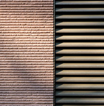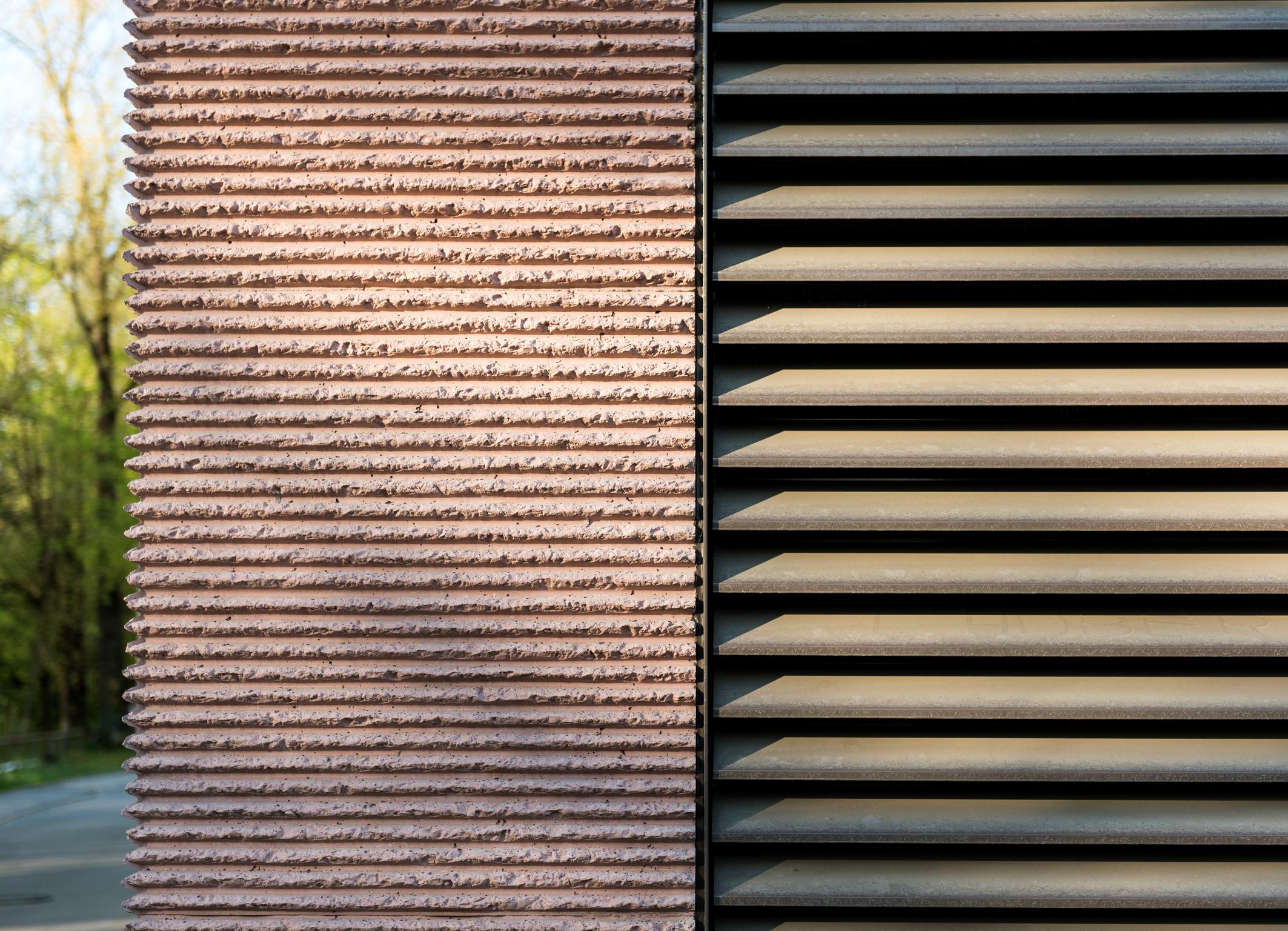 Die rötliche, horizontal linierte Leichtbetonfassade erscheint sehr homogen und fugenlos.