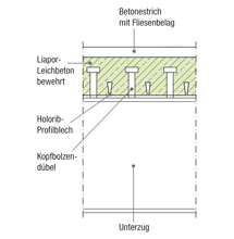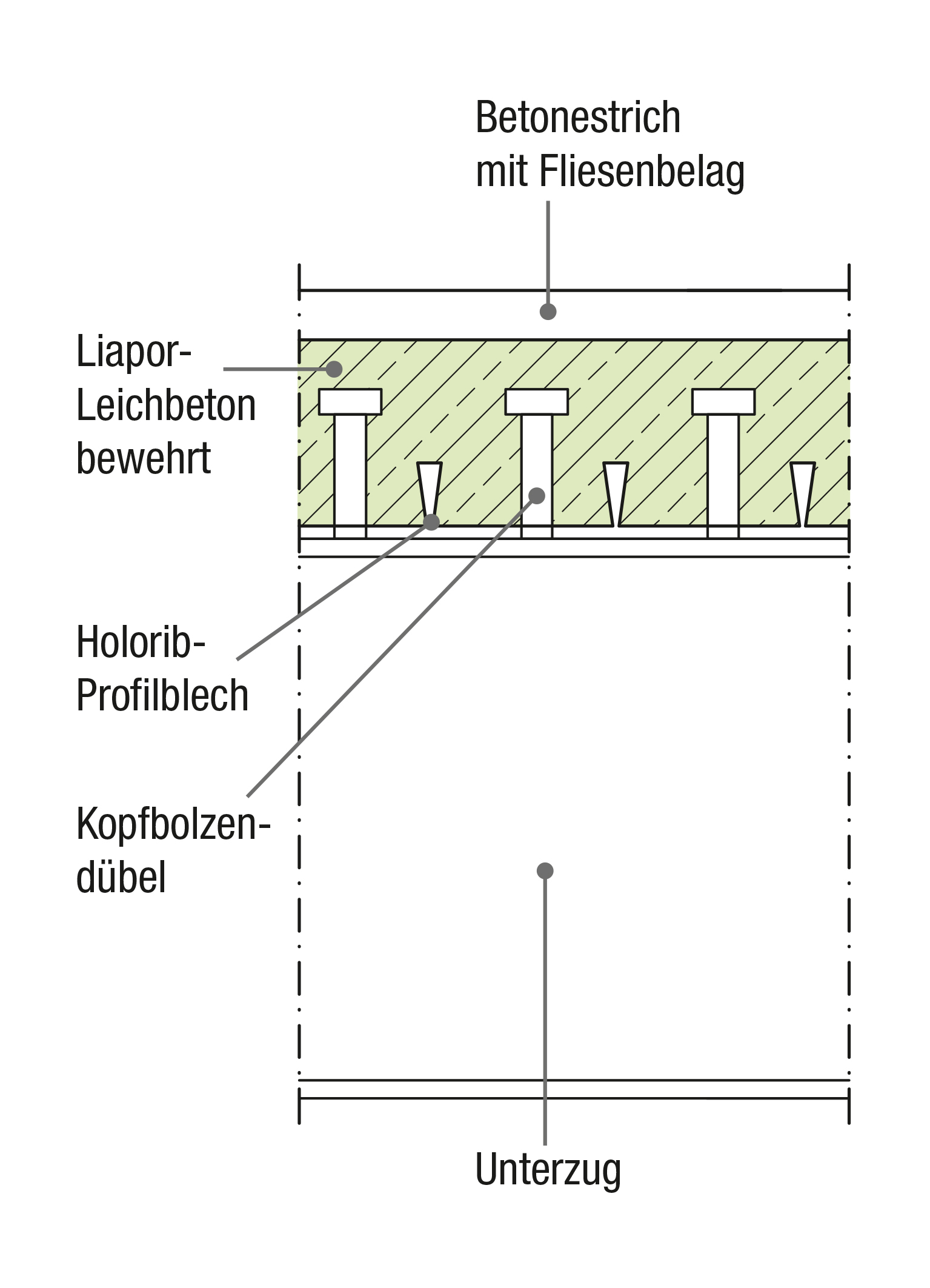 Im Detail besteht die neue Holorib-Leichtbeton-Stahlverbunddecke von unten nach oben aus den Stahlträgern mit Kopfbolzendübeln, die auf den Unterzügen montiert wurden, und den Holorib-Profilblechen, welche als Schalung dienen. Darüber folgt eine 16 Zentimeter starke bewehrte Schicht aus Liapor-Leichtbeton vom Typ LC 25/28 D1.8 als Tragschicht. Den oberen Abschluss bilden Betonestrich und ein geringmächtiger Fliesenbelag.
