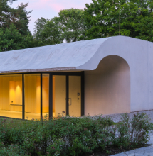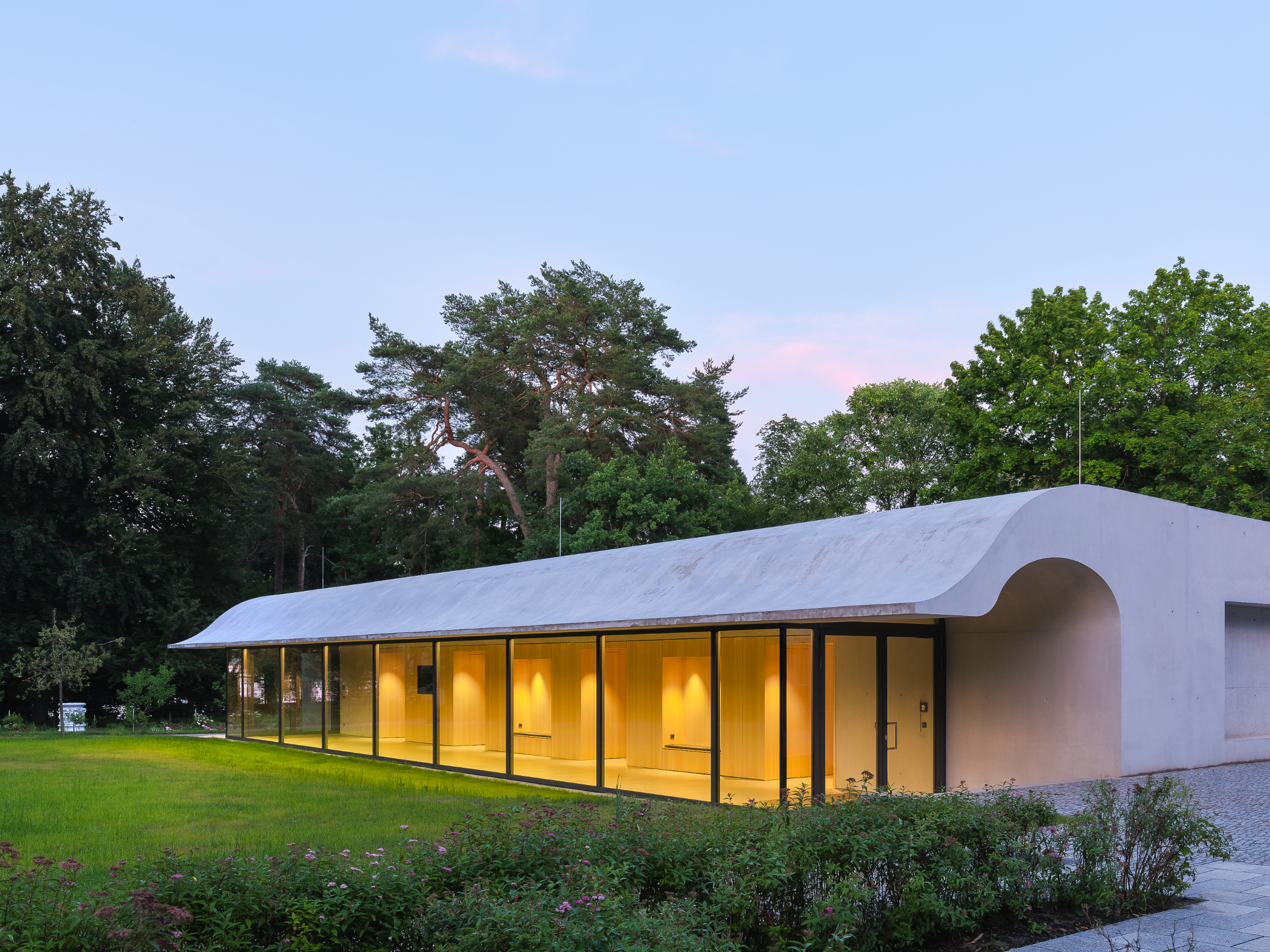 Das Seminargebäude der Berliner Gedenkstätte „Haus der Wannsee-Konferenz“ zeichnet sich durch klare Formen und ein auf das Wesentliche reduziertes Erscheinungsbild aus. Augenfällig ist das weit ausschwingende, gewellte Dach: Es vermittelt subtile Dynamik, verbindet Bestand und Neubau und mindert optisch die Erscheinung des Gebäudes. Errichtet wurde es, wie die gesamte Gebäudehülle, monolithisch aus Liapor-Leichtbeton.