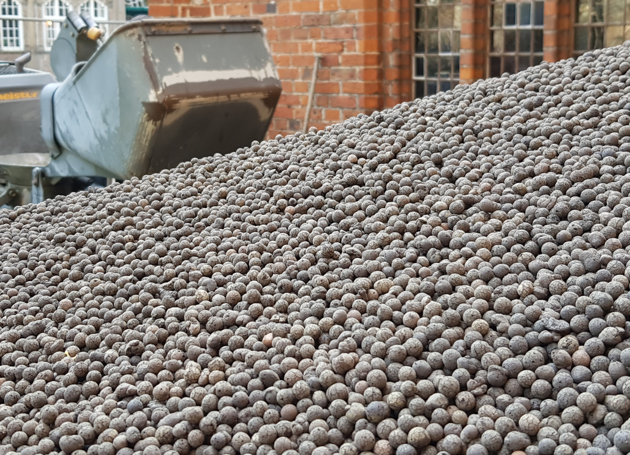 Für die Verfüllung des Mittelschiffbodens kamen insgesamt 58 Kubikmeter der zementgebundenen Liapor-Schüttung zum Einsatz, bestehend aus Liapor 4-8 mit einem Zementanteil von etwa 150 kg/m3 mit ca. 90 Liter Wasser. Die lose Blähtonschüttung wurde vom Liapor-Werk Pautzfeld auf die Baustelle geliefert und in einem temporären Zwischenlager gespeichert. Vor Ort erfolgten die Zement- und Wasserzugabe und der Eintrag der Schüttung mittels zweier herkömmlicher Estrichboys. Die gesamte Schüttung wurde in zwei Etappen im Mai und im Dezember 2020 mit einer durchschnittlichen Gesamthöhe von 28 Zentimetern eingebracht. Die Schüttung war nach zwei Tagen begehbar und nach vier Wochen belegreif für den weiteren Fußbodenaufbau. Dieser umfasste einen sieben Zentimeter starken Zementestrich, eine ein Zentimeter dicke Klebeschicht und als oberen Abschluss sechs Zentimeter hohe Pflasterziegel in rötlichem Farbton.