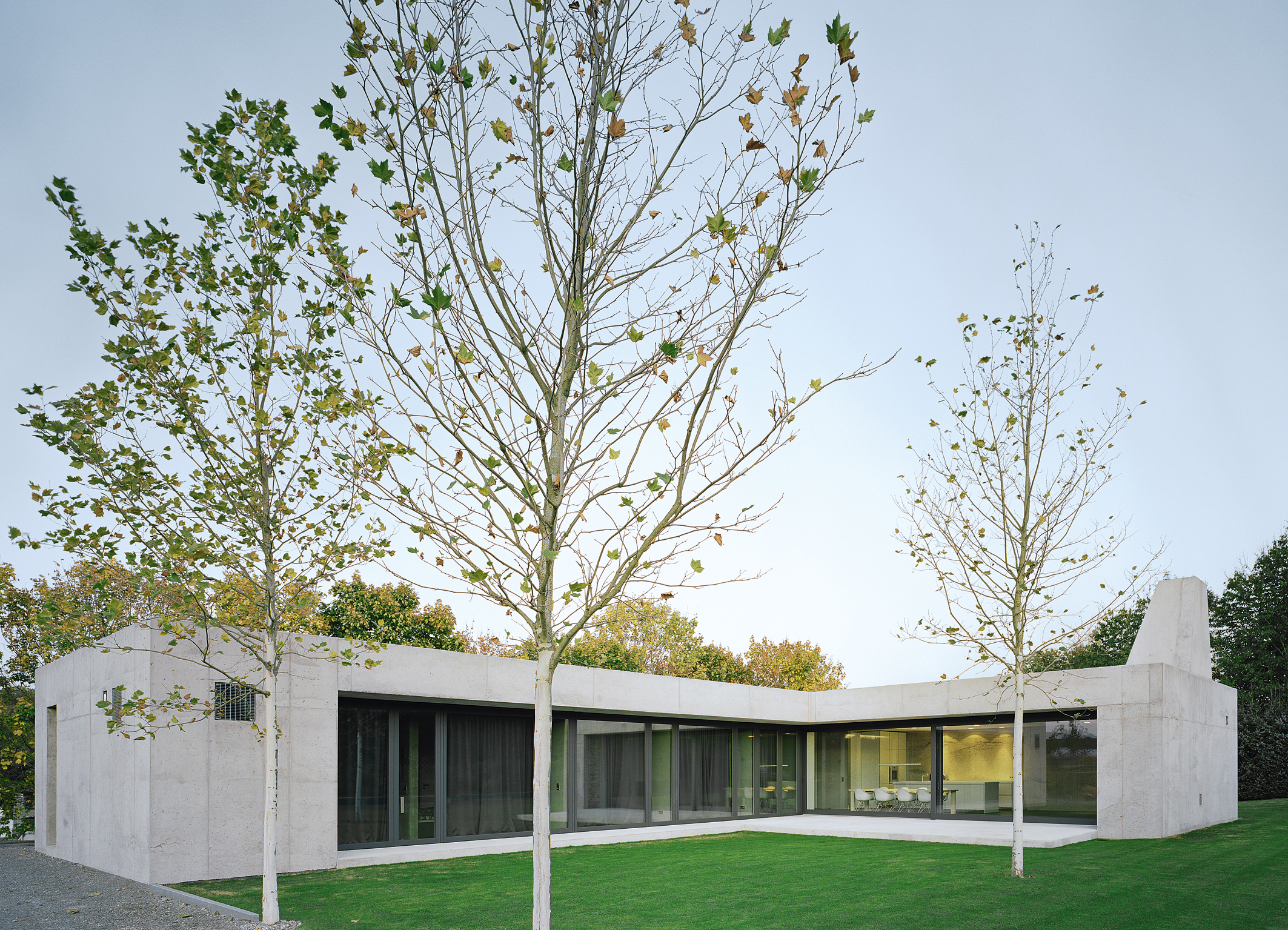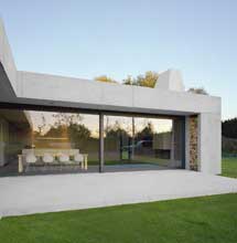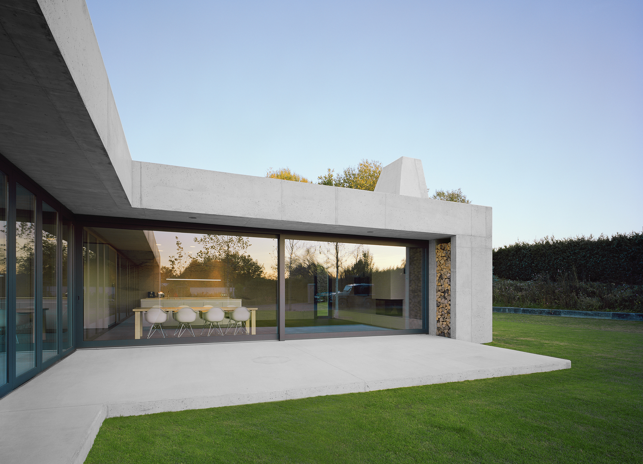 Das 220 Quadratmeter große Haus weist auf der Westseite große, raumhohe Fenster auf, die den Zugang zum Garten und in die Natur ermöglichen. Die Fassade im Norden und Osten ist dagegen bis auf wenige schmale, geschosshohe Schlitze geschlossen. Im Inneren des Objekts herrscht analog zum architektonischen Gesamtkonzept ein ganz besonderes Ambiente der Klarheit und Schlichtheit. So weisen sämtliche Wohnräume ein einfaches Holzparkett auf und nur wenige maßgefertigte Einrichtungsgegenstände. So kommt einmal mehr die besondere Sichtbetonoptik der Decken und Wände zur Geltung. Sie erscheinen so, wie sie nach dem Ausschalen sichtbar wurden: einheitlich und glatt, aber bei genauerer Betrachtung mit ganz individuellem Relief und unterschiedlichen Farbgebungen.