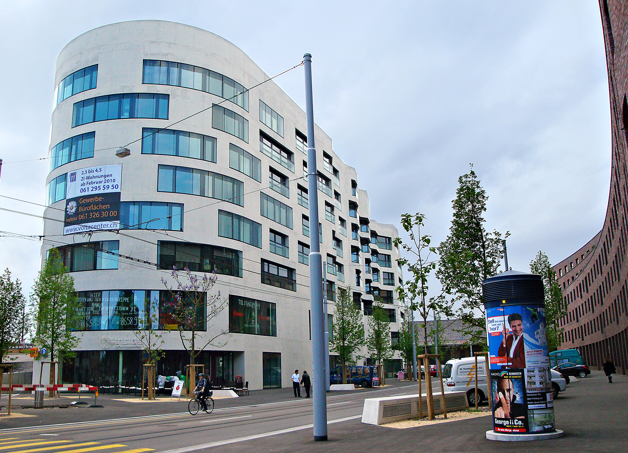 Der Stadtteil Äusseres St. Johann, ein Quartier im Norden von Basel, wird zur Zeit städtebaulich völlig neu gestaltet. Durch die Verlegung der Hafenbetriebe sowie durch den Rückbau alter Anlagen wandeln sich dabei am Rheinufer ehemals industriell genutzte Areale zu neuen, attraktiven Stadtgebieten, gleichzeitig wird das Gebiet am Vogesenplatz durch zahlreiche neue Bauten infrastrukturell aufgewertet. Durch die weitgehend unterirdische Führung der Nordtagente wurde vorab bereits die Vorrausetzung dafür geschaffen, das Quartier vom Verkehr zu entlasten und das Wohnumfeld nachhaltig zu verbessern. Eine wichtige Rolle spielt dabei am Vogesenplatz der Bahnhof St. Johann mit einer neuen S-Bahn-Haltestelle, der künftig eine Drehscheibe des öffentlichen Verkehrs in diesem Teil von Basel darstellen wird. Herzstück des Ensembles ist das neue Volta Zentrum am Bahnhofsplatz, das im Februar 2010 unter der Bauherrschaft der Implenia Generalunternehmung AG in Basel fertiggestellt wurde. In den beiden unteren Stockwerken des markanten siebenstöckigen Gebäudes finden sich Läden, Restaurants und Büros, in den oberen Geschossen entstanden insgesamt 74 Wohnungen.