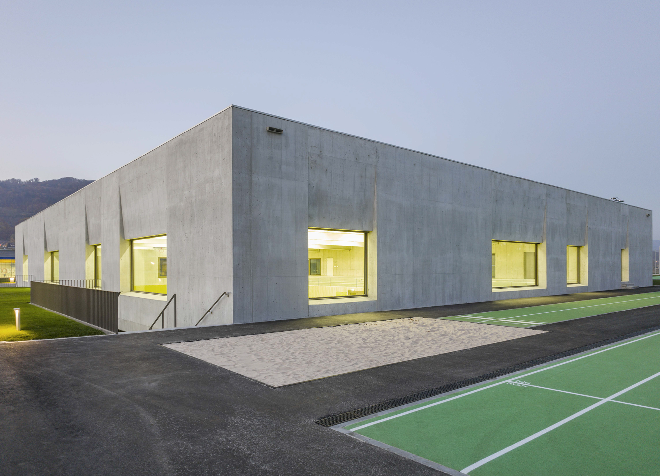 Im schweizerischen Oensingen bildet die Ende 2015 fertiggestellte Multifunktionshalle das neue Herzstück des dortigen Sportareals. Es ist ein quaderförmiger, rund 17.500 Kubikmeter großer Gebäudekubus, der bis zu 3,5 Meter tief ins Erdreich eingegraben ist. Der Bereich unter Terrain weist Normalbetonwände inklusive Außendämmung auf und die Decke wurde als Stahlträgerkonstruktion umgesetzt. Der restliche Teil des Baukörpers besteht dagegen aus einem in heller Sichtbetonoptik gehaltenen Liapor-Leichtbeton, der im schweizerdeutschen Sprachgebrauch auch als Isolations- oder Dämmbeton bezeichnet wird. „Der bewusst archaische, massive und robuste Gebäudecharakter basiert auf der klaren Grundrissstruktur, der Reduktion der Materialien und der massiven Bauweise mit Dämmbeton. Dessen Materialität und Ausführungsqualität prägen das Gebäude und beeinflussen entscheidend das optische Bild des Gebäudes“, erklärt Verena Hellweg als zuständige Architektin der ffbk Architekten AG, die zusammen mit dem Ingenieurbüro BSB+Partner aus Oensingen die Projektierung und Ausführung des Objekts übernahm.