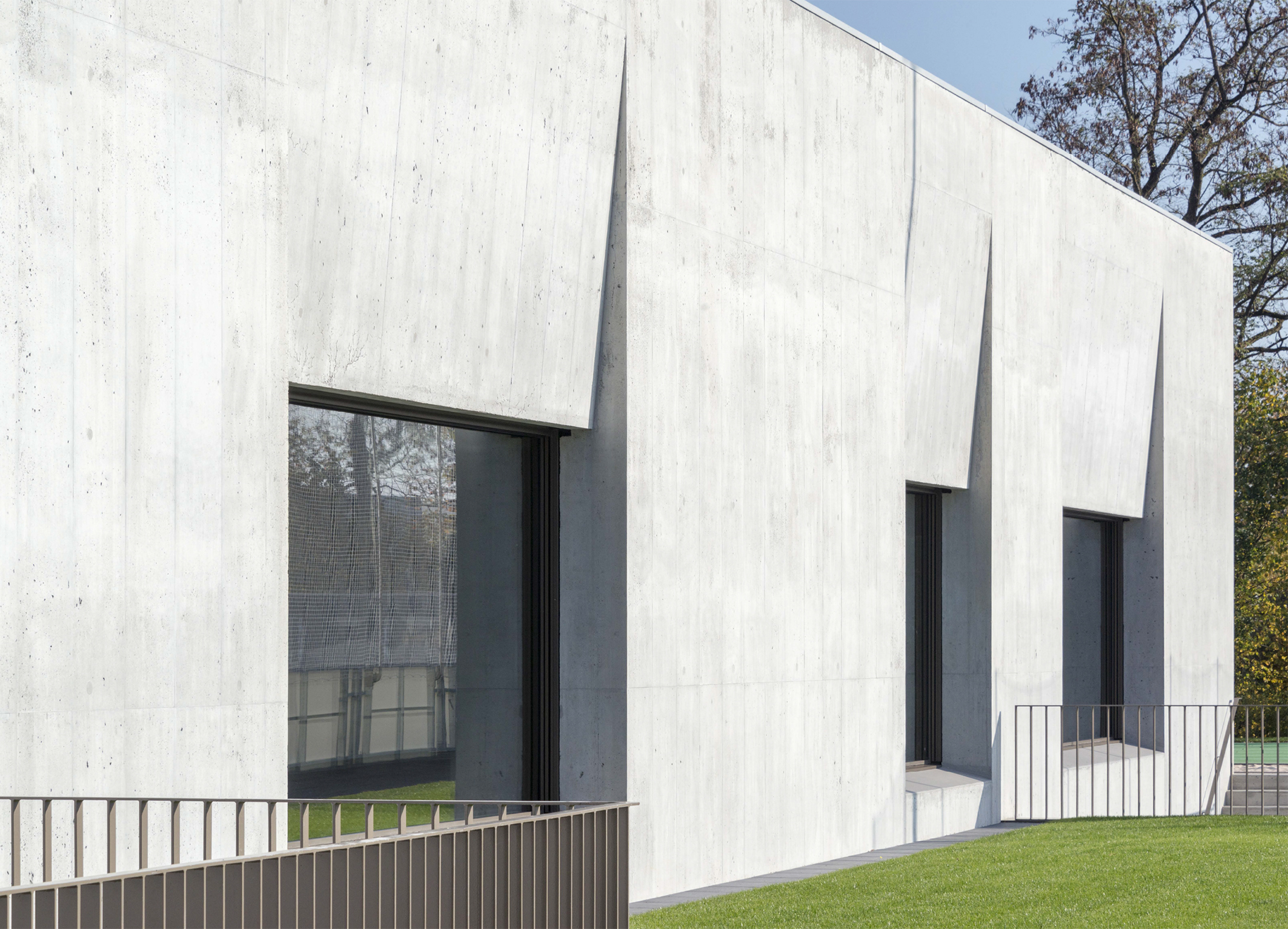 Der Liapor-Leichtbeton der Gebäudehülle prägt das massive, archaische Erscheinungsbild der neuen Multifunktionshalle.