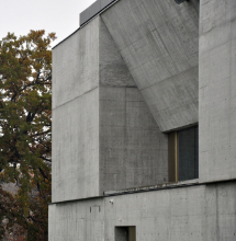 Gemäß des gewählten Gliederungsprinzips ist die Raumabfolge im oberen, öffentlichen Gebäudeteil klar organisiert. Den Zugang zum Neubau gewährt der vorgelagerte Hof, der gleichsam trennend wie verbindend zwischen Bestand und Neubau wirkt. Von hier gelangt man ins Foyer und anschließend in den zentralen, für 120 Personen ausgelegten Verabschiedungsraum. Sein Inneres ist wie das Foyer mit Akustikputz belegt. An sämtlichen Außenflächen zeigt sich dagegen – wie auch in den Technikräumen des Untergeschosses – die reine, unverfälschte Sichtbetonoptik des Liapor-Leichtbetons, mit dem die gesamte Gebäudehülle in 50 bis 60 Zentimeter Stärke errichtet wurde. „Der Leichtbeton erzeugt eine ganz eigene, sinnliche Ästhetik“, so Christian Tabernig. „Man kann sich der haptischen Wirkung und Erscheinungsform des rohen Materials nicht entziehen, es stimuliert die Wahrnehmung.“