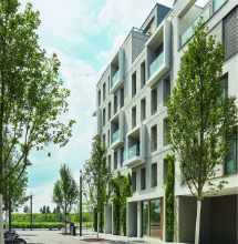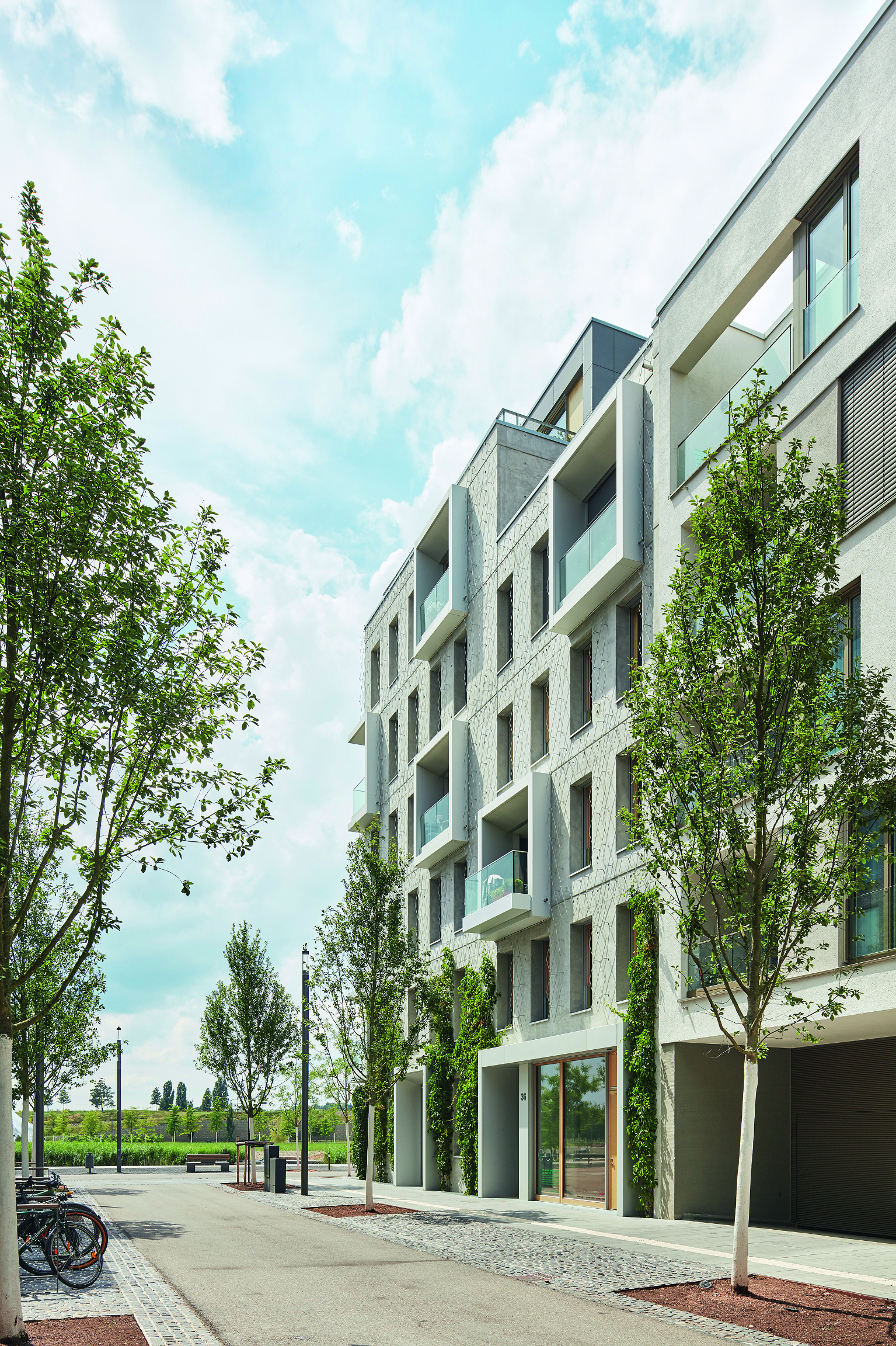 Herausragendes Merkmal der Grünen Ecke ist die monolithische Gebäudehülle aus hellem Liapor-Leichtbeton. Die Wahl des Baustoffs hatte für die Architekten klare Gründe: „Mit dem Leichtbeton ließ sich der gewünschte einfache, schlichte Charakter des Objekts ideal umsetzen, auch gemäß den strikten Vorgaben für Baukörper und Gebäudefluchten“, erzählt Franz-Josef Mattes. „Der Baustoff Beton ist dabei ohne zusätzliche Außendämmung jederzeit direkt sichtbar und ablesbar und verleiht der Fassade ein natürliches, lebendiges Erscheinungsbild.“ Die gesamte Außenhülle des Objekts ist klassisch perforiert durch die großen Öffnungen im Erdgeschoss und die herausragenden, mit Laibungen gefassten Loggien in den Obergeschossen.