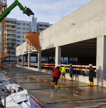Eine konventionelle Gefälledämmung schied aufgrund der benötigten Druckfestigkeit von vornherein aus. Die erforderliche Belastungsklasse SLW 30 ließ sich dagegen mit einem leichten Liapor-Gefällebeton problemlos erreichen. Zum Einsatz kamen insgesamt 200 Kubikmeter Liapor-Leichtbeton mit einer Betongüte LC16/18D1.6 mit Liapor F4,5. Bei einer Rohdichte von lediglich 1.600 kg/m³ sorgte der Liapor-Leichtbeton auch dafür, dass die unterlagernde Tiefgarage und Kellerräume nicht über die Maßen belastet werden. Das hohe Wärmedämmvermögen der Liapor-Schüttung spielte dabei nur eine untergeordnete Rolle, da ein Großteil der unterlagernden Räume ohnehin nicht beheizt ist. Insgesamt wurden rund 1.500 Quadratmeter unterschiedlichster Grundrissgeometrien mit dem Baustoff verfüllt. Hergestellt und geliefert wurde der Liapor-Gefällebeton vom Fertigteilwerk der Hönninger GmbH in Kirchseeon. Hier wurde in enger Abstimmung mit den Liapor-Experten auch die Rezeptur für den Gefällebeton entwickelt, um das Optimum zwischen Druckfestigkeit und Gewicht umsetzen zu können.