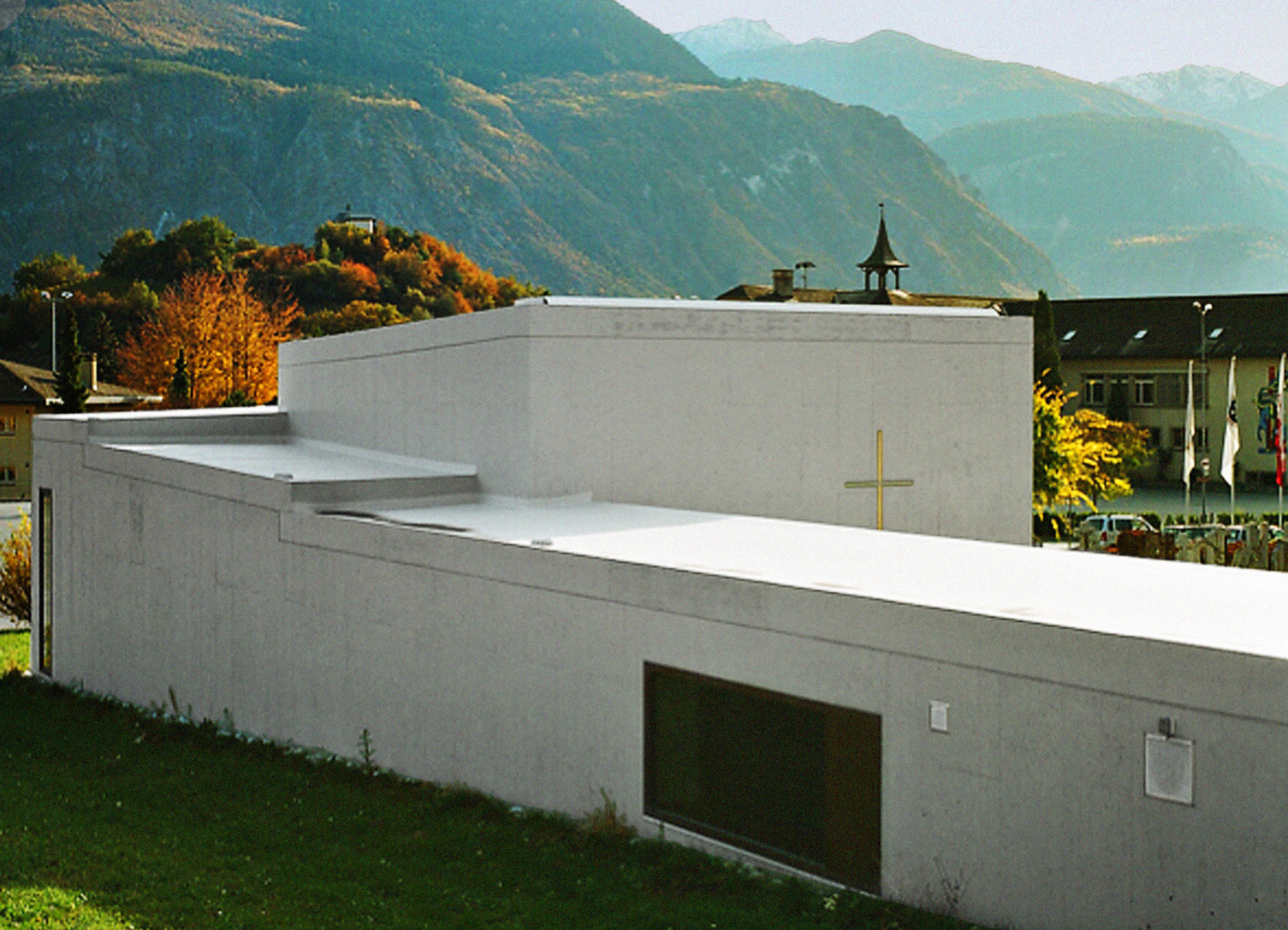 Die neue Friedhofskapelle schließt zusammen mit dem vorgelagerten Platz den erweiterten Friedhof ab und bildet eine räumlich erfassbare Abfolge aus Kirche, Friedhof und Kapelle. Unterschiedlich hohe Mauern empfangen die Besucher und leiten zum Eingang der Kapelle hin. Ein steigender Grad der räumlichen Umschlossenheit bereitet auf den zentralen Raum des Abschieds vor. Beim Verlassen der Anlage erfährt der Besucher in umgekehrter Weise eine entsprechende Öffnung zurück ins irdische Leben. Bei der Planung und Umsetzung des Bauwerks und seiner Ausgestaltung wurde dabei bewusst auf Interaktion mit dem angrenzenden Umfeld geachtet. "Lichtschlitze am Boden, in den Wänden und in der Decke stellen unterschiedliche Beziehungen zur Umwelt her und lassen der Bestimmung der Räume folgend unterschiedliche Lichtstimmungen entstehen", erklärt Architekt Norbert Truffer. "Der Baukörper als monolithisches Objekt fügt sich gleichzeitig harmonisch in das umgebende Rebland ein und wird so zu einem gewachsenen Bestandteil der Anlage."