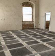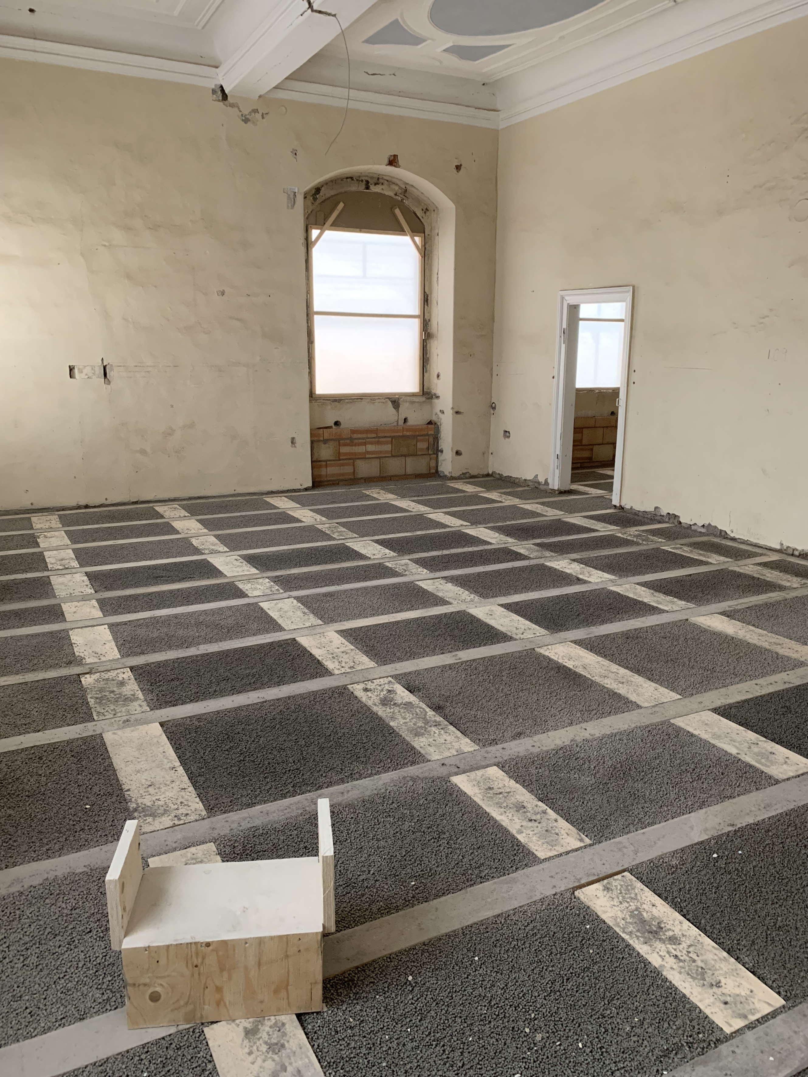 Die zementgebundene Liapor-Schüttung trägt im ersten Stockwerk dazu bei, dass die späteren Nutzlasten flächig auf die Gewölbedecke verteilt werden.