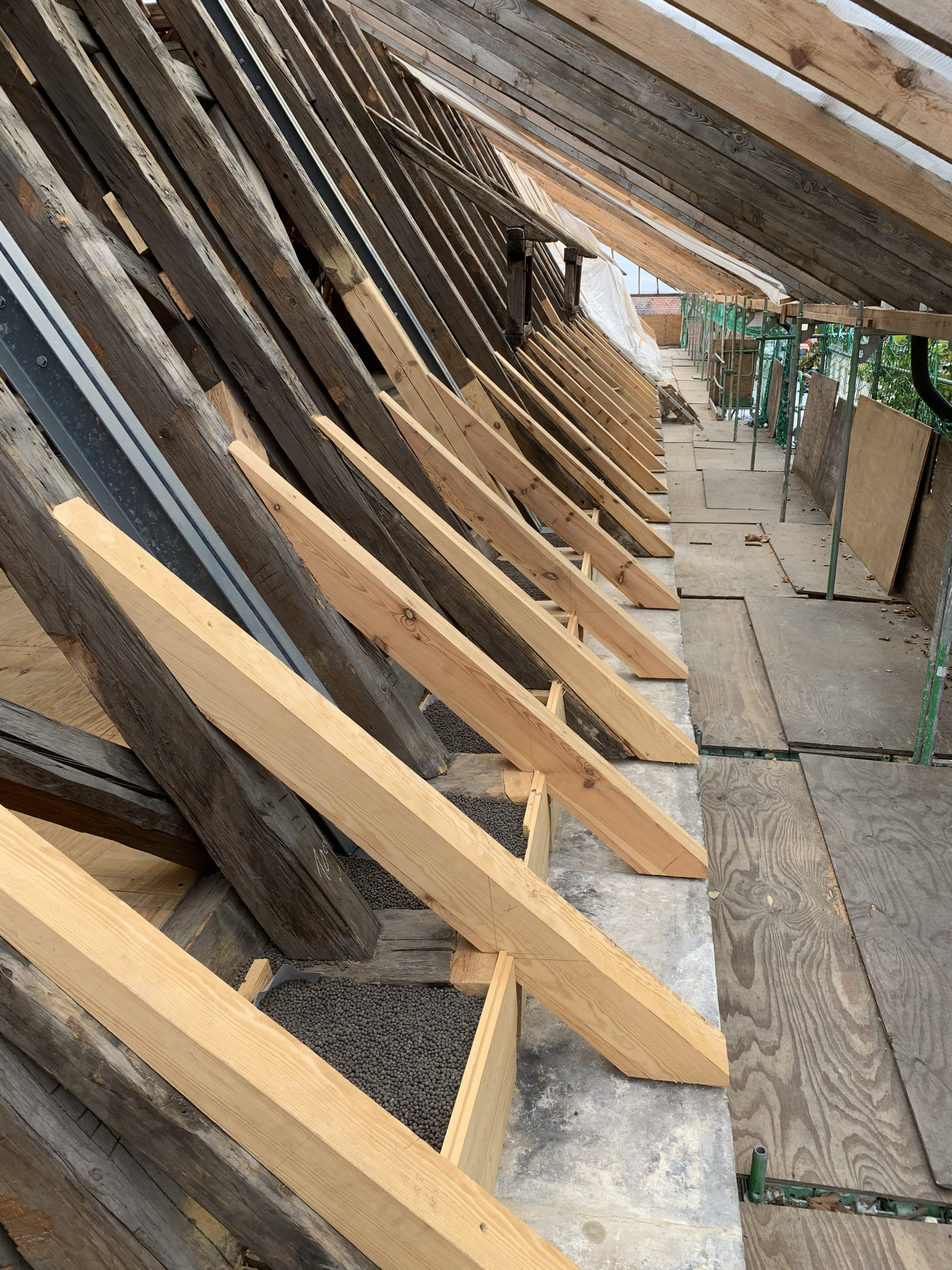 „Die ziegelgedeckte, mehrflügelige Dachanlage mit ihren vielen Verschneidungen und Kehlbereichen war stark korrodiert und an vielen Stellen undicht. Die vorhandene Lehmstakung wirkte dabei wie ein Schwamm und sorgte für weitreichende Feuchteschäden in und an der gesamten Dachkonstruktion“, berichtet Stefan Stenglein, der zuständige Tragwerksplaner von B+D Ingenieure in Kulmbach. „Der gesamte Dachaufbau war letztlich nicht mehr tragfähig und musste grundlegend statisch ertüchtigt werden.“ Zuständig dafür war die Denkmalbau GmbH aus Ettersburg. Sie versah Anfang 2020 unter anderem die Bohlendecke, die Gratbereiche und die Traufpunkte mit neuen Balken und Aufschiebern. Im Traufbereich wurde dann eine lose Liapor-Trockenschüttung in etwa 20 Zentimetern Stärke eingebracht. „Die Blähtonschüttung sorgt hier für die erforderliche Wärmedämmung des Wandkopfs zum Kaltdach hin“, erläutert Stefan Stenglein. „Gleichzeitig ist die Schüttung diffusionsoffen und reguliert das Raumklima, was weiteren Feuchteschäden langfristig entgegenwirkt und auch der erneuten Ausbreitung des Holzschwamms vorbeugt.“ Der Eintrag der Liapor-Schüttung verlief problemlos: „Liapor-Blähton ist besonders leicht, und die Schüttung ließ sich hier sehr einfach, schnell und lückenlos einbringen“, erzählt Matthias Mönch von der Denkmalbau GmbH.
