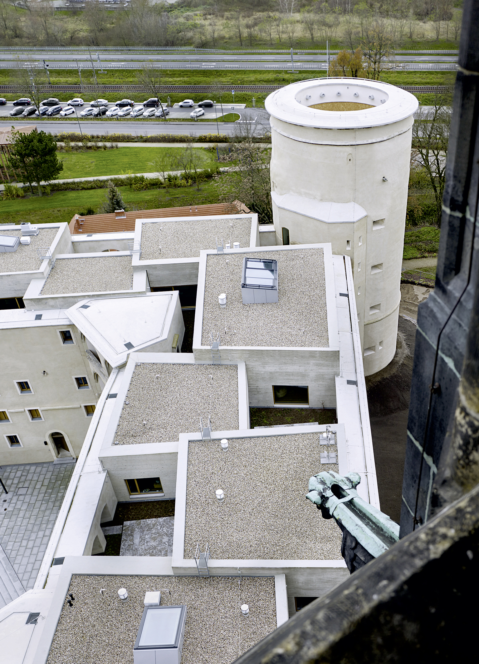 Nach diesem Ansatz entstanden auf dem Dach des Schlosses insgesamt sieben Quader aus Liapor-Leichtbeton, die die Lehr-, Gemeinschafts- und Arbeitsräume des Predigerseminars beinhalten. „Der Liapor-Leichtbeton ist dank des geringen Gewichts mit den statischen Gegebenheiten bestens vereinbar“, betont Prof. José Gutierrez Marquez. Dazu zählt vor allem die begrenzte Tragfähigkeit des unterlagernden Gewölbes, das einen Aufbau etwa in Ziegelbauweise nicht zugelassen hätte. Die Lasten der Leichtbetonbauten, deren Fundamente auf die Kappenzwickel des Gewölbes gesetzt wurden, werden dagegen sicher ins Mauerwerk abgeleitet. „Gleichzeitig passt der Liapor-Leichtbeton am besten zum monolithisch gebauten Haus und der Weiterbau folgt damit dessen Geist“, so Prof. José Gutierrez Marquez. „Die massive, gegossene Einschaligkeit fügt sich auch in die vorhandenen, kräftigen Dimensionen des Hauses ein.“ Darüber hinaus sorgen die Dämmbetonwände auch für eine ausreichende Wärmedämmung. Nicht zuletzt überzeugte der Baustoff auch unter ganz praktischen Gesichtspunkten: „Das einschalige Bauen mit Liapor-Leichtbeton ist von der Bauleitung und vom technischen Aufwand her besonders einfach, da hier keine technischen Schnittstellenprobleme wie oft beim zweischaligen Bauen auftreten, und die gesamte Errichtung mit nur einem einzigen Unternehmen und damit einem einzigen Ansprechpartner ausführbar ist“, so Prof. José Gutierrez Marquez.