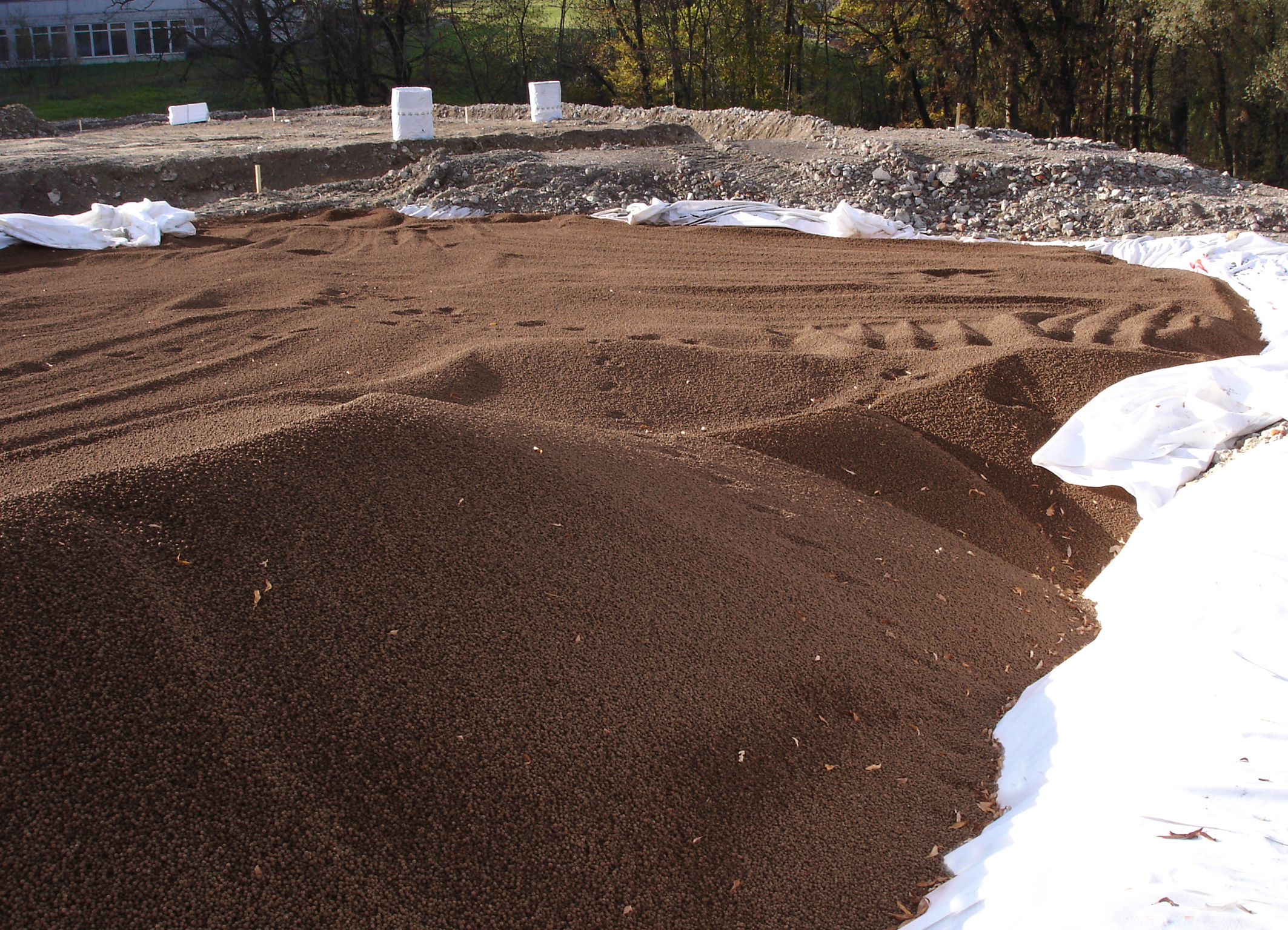 Die Liapor-Blähtonkörnung wurde zwischen den beiden bis zu vier Meter hohen Erdwällen eingebracht und mit einem Schutzvlies versehen.