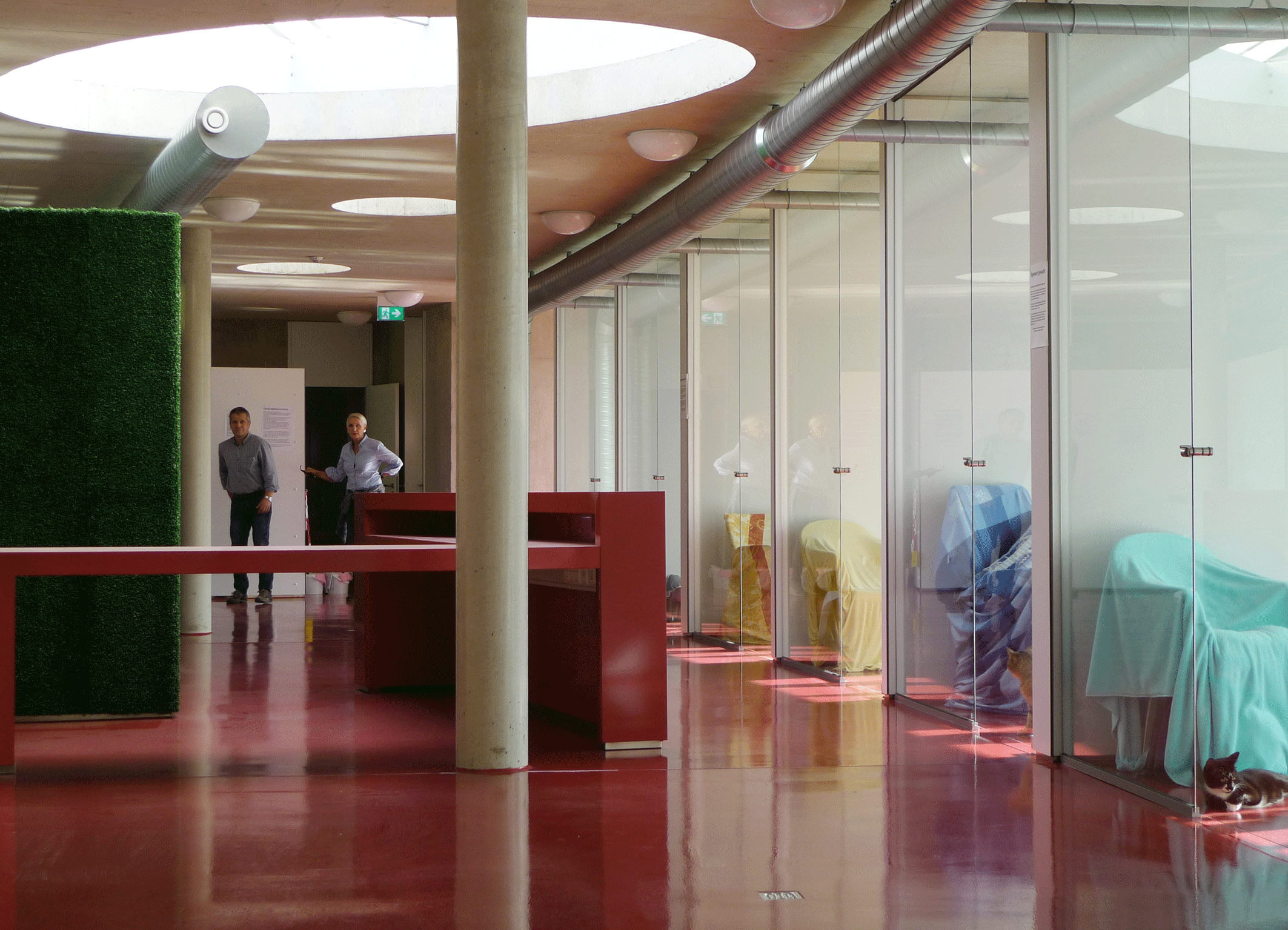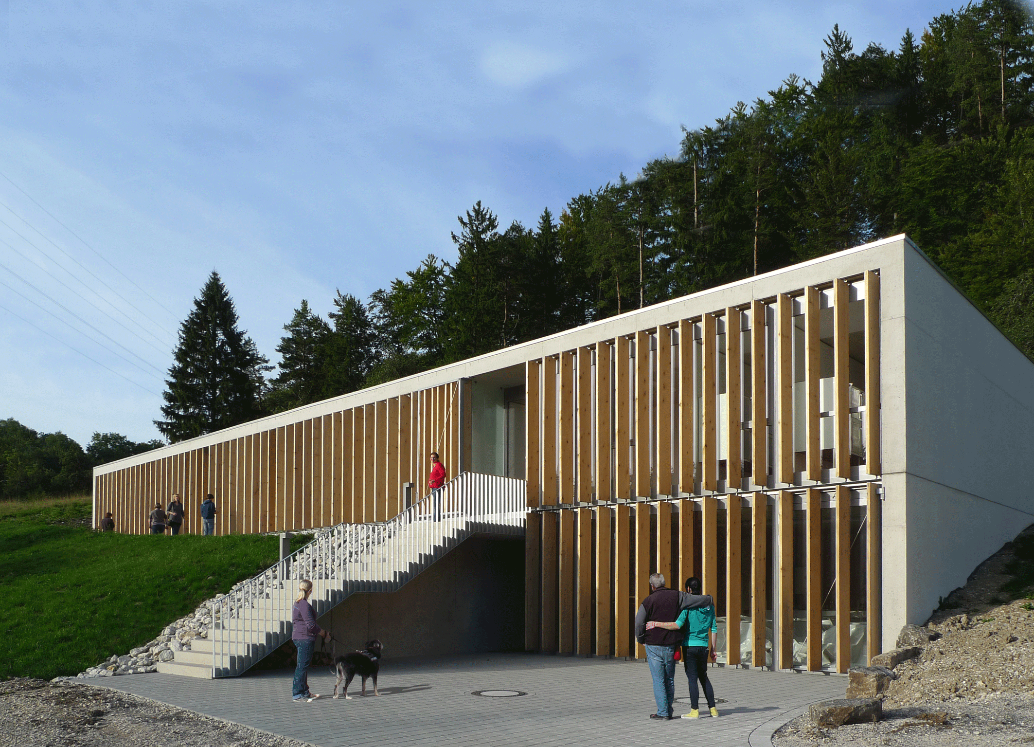 Das riegelförmige, am Hang liegende Gebäude ist charakterisiert durch seine markanten Sichtbetonflächen und die große Glasfassade hinter den naturbelassenen Holzlamellen. Hinter dieser "Palisade" beherrschen Farbe, Licht und Transparenz die Atmosphäre im Inneren des Gebäudes. In sanfter Wölbung wenden sich die zehn Katzenräume den Betreuern und Besuchern zu, ermöglichen beiderseitigen Sichtkontakt und fördern, hinter Glas geschützt, Vertrauen und Zuneigung. Das Haus beinhaltet auf 490 Quadratmetern neben Arbeitsbereichen, Futterküche und Lagerflächen zwei Quarantänestationen, einen Arzt- und einen Krankenraum sowie einen Gemeinschaftsraum im Untergeschoss. Insgesamt können in dem Tierheim, das nur dank einiger großzügiger Erblassungen von tierliebenden Menschen realisiert werden konnte, bis zu 70 Katzen untergebracht und gepflegt werden.