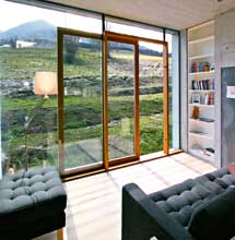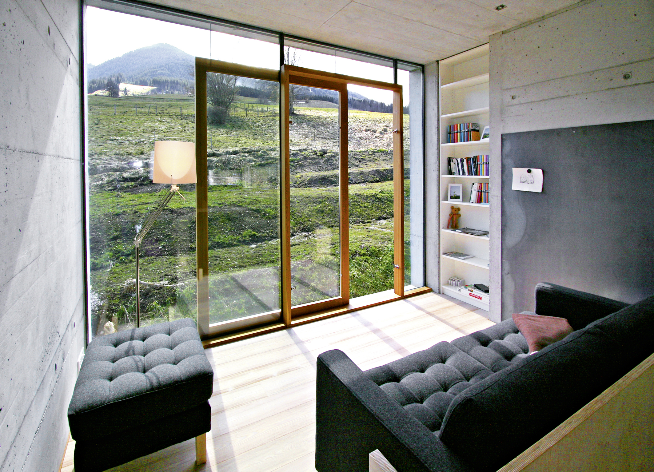 Markant an einem Westhang mit Blick auf die Landschaft gelegen, bietet das 250 Quadratmeter große Haus neben dem Wohnbereich für die Bauherren auch eine Einliegerwohnung im Erdgeschoss. "Unser Haus ist sehr traditionell: Dicke Mauern unten, leichte Bauweise oben – so hat man in den Bergen schon immer gebaut. Hier muss ein Haus funktionieren und Wärme und Schutz geben", erklärt Boris Alexy. Und genau diese Ansprüche erfüllt das neue Eigenheim durch den verwendeten Liapor-Isola-tionsbeton. Denn es bietet mit einer Wandstärke von 50 Zentimetern und den dreifach verglasten Fenstern optimale Energieeffizienz, ohne dass eine zusätzliche Dämmung aufgebracht werden musste. Und das ist gut so, denn die Bauherren wollten innen wie außen genau die lebendige, markante Struktur der Betonwände beibehalten, wie sie nach dem Ausschalen zu sehen war.
