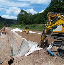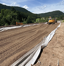 Um bei der B 294 im Kinzigtal weitere Absenkungen zu verhindern, wurde die Böschung auf rund 100 Metern Länge mit einer rückverhängten Spritzbetonschale gesichert. Gleichzeitig konnte der Auflastdruck des Straßenkörpers um mehr als 75 Prozent reduziert werden – mithilfe einer einen Meter mächtigen Liapor-Geoschüttung als Straßenunterbau.