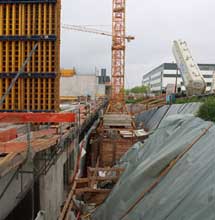 A total of approximately 1,700 cubic metres of Liapor expanded clay with a grain size of 4 to 8 millimetres was used to backfill the new Bosch Development Centre in Abstatt. As a self-compacting filling material, the Liapor expanded clay granules distribute the forces bearing on them evenly and reduce the earth pressure by a factor of 2 to 3 compared with conventional subsoils. This load reduction is due to the material's low dry bulk density of approximately 350 kg/m³ and the relatively high rigidity of the expanded clay grain with its fine, even pore structure. This gives the Liapor spheres the necessary stability of form, eliminating any subsequent compression.